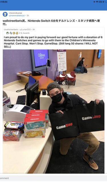 ゲームストップ株で儲けたReddit民、スイッチを小児病院に寄付