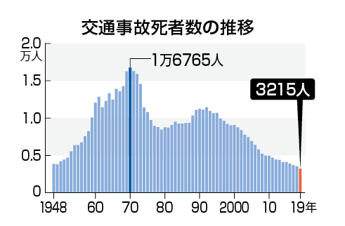 日本での1948年からこれまでの交通事故死者数を合計すると年平均8000人として56万人となる