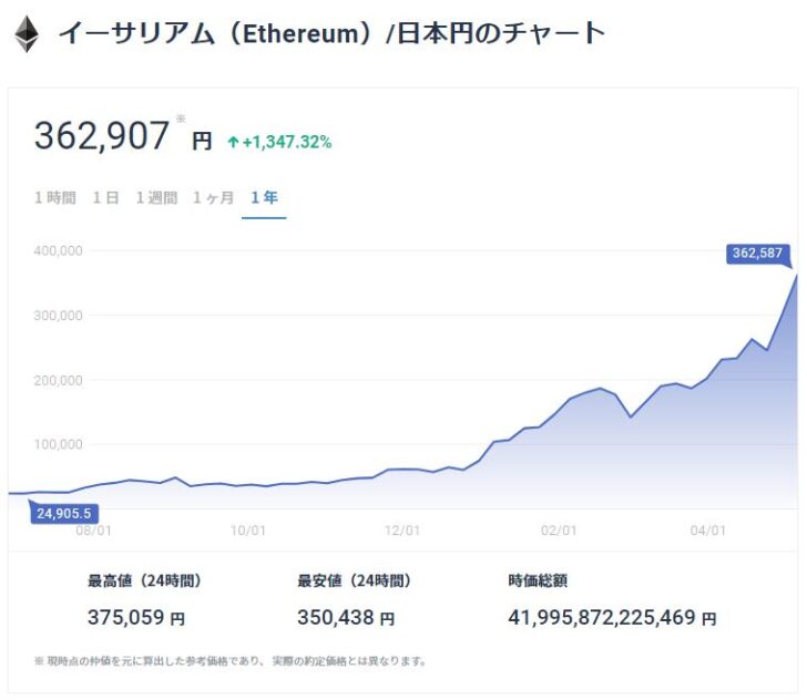去年3万円で買ってた1イーサ、今見たら34万になってた。