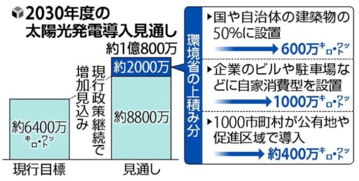 政府は30年度までに温室効果ガスの排出量を13年度比で46%以上削減する目標を掲げ、再生可能エネルギーの拡大に向けて計画の見直しを進めている。政府の現行計画では、30年度の太陽光発電容量を約6400万キロ・ワットとしている。すでに19年度までに約5600万キロ・ワット分が導入済みで、政府は今のペースを継続すれば、30年度には約8800万キロ・ワットに達すると見込む。