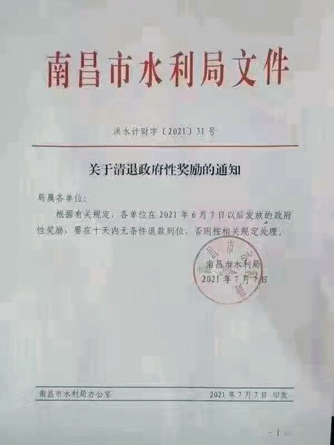 江西省南昌市の水資源局が職員に支給した報奨金の返還を求めています (2021/7/7)