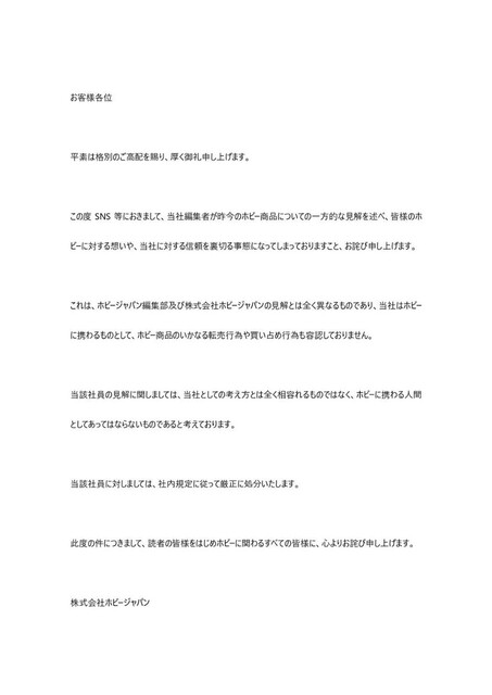 これを受け、ホビージャパン社は公式サイトで謝罪し、「ホビージャパン編集部及び株式会社ホビージャパンの見解とは全く異なるものであり、当社はホビーに携わるものとして、ホビー商品のいかなる転売行為や買い占め行為も容認しておりません」と明言。「当該社員の見解に関しましては、当社としての考え方とは全く相容れるものではなく、ホビーに携わる人間としてあってはならないものであると考えております。当該社員に対しましては、社内規定に従って厳正に処分いたします」としていた。