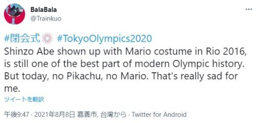 Twitterを見てみると「ポップカルチャーのポケモンマリオを期待していた」、「スーパーマリオは登場しませんでした。困った」、「リオオリンピックの閉会を思い出し、マリオが開幕するだろうと思いました」、「マリオにオリンピック聖火を消させたらよかったのに」、「この政治的な何か……歌とスーパーマリオはどこにありますか?」、「マリオはオリンピックに出場しませんでした…彼がパリに現れることを願いましょう」、「安倍マリオは最高に興奮したのに今日の閉会式はピカチュウもマリオもなし。悲しすぎる」、「理由はわからないけど、閉会式にはゴジラ、マリオ、ポケモンが登場することを期待してた」という国外の人も任天堂キャラクターが出てくると信じていたようで相当ガッカリしたようだ。