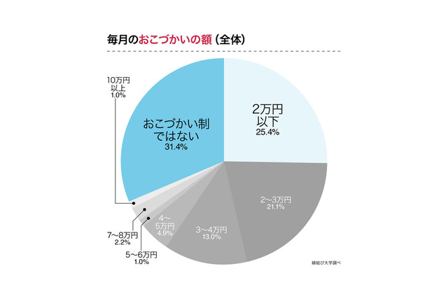 おこづかい制の人の比率を世帯年収別に分類すると、世帯年収「1,001万円以上」を境におこづかい制の比率が半数以下になることがわかった。世帯年収が1,000万円以下の比率をみると、どの世帯年収でも6~7割がおこづかい制をとっている。世帯年収が400万円以下の場合、41.2%がおこづかいの額が「2万円以下」と答えている。他の世帯年収別のおこづかい額と比較しても、「2万円以下」の人の割合は年収400万円の層がもっとも高かった。