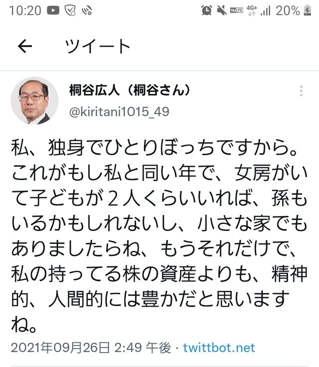1: 2021/09/27(月) 22:22:53.37 ID:F2h+dbHld 悲しいなぁ https://swallow.5ch.net/test/read.cgi/livejupiter/16327 … 続きを読む 株主優待の桐谷さん「いくら金持ってようが嫁と子供がいる人の方が幸せ」