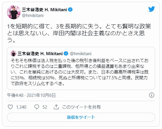 1を短期的に得て、3を長期的に失う。とても賢明な政策とは思えないし、岸田内閣は社会主義なのかとさえ思う。 https://t.co/ldjrzUzFwZ — 三木谷浩史 H. Mikitani (@hmikitani) … 続きを読む 楽天三木谷が苦言「株に増税する岸田は社会主義者、金融市場が崩壊すんぞ。そもそも二重課税だろうが!」
