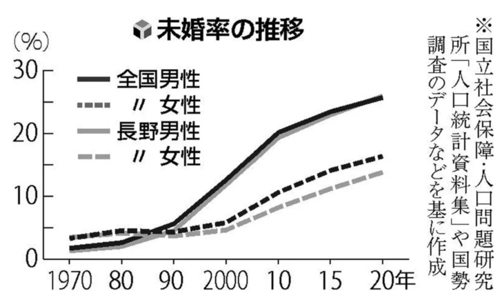 50歳までに一度も結婚していない「生涯未婚率」は男性25・87%、女性13・84%。男性の4人に1人は結婚していないことになる。