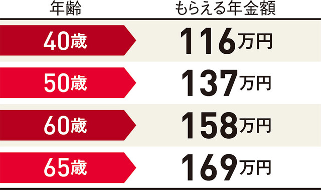 上の表は、平均標準報酬月額32万円(生涯の平均年収384万円)で試算した、リタイア年齢ともらえる年金額。40歳でリタイアすると、65歳まで勤め上げた場合に比べて、年53万円も年金受給額が下がる(井戸美枝氏による試算)。