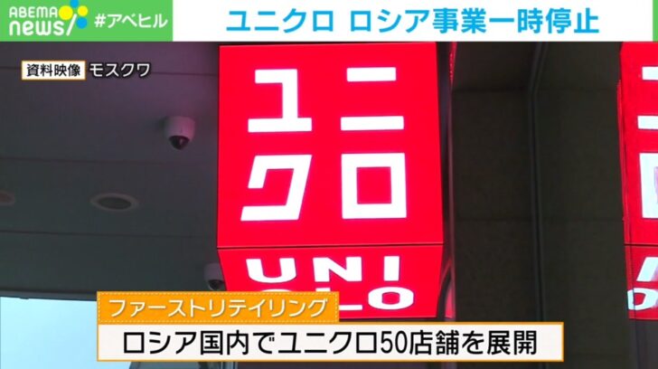 1: 2022/03/10(木) 19:52:02.67 ID:38lCkRt79衣料品チェーン「ユニクロ」を運営するファーストリテイリングは10日、ロシアでの事業を一時停止すると発表した。1週間~10日ほどの準備期間を経て、ロシア国内の全50店舗の営業を休止する。「現在の紛争を取り巻く状況の変化や営業を継続する上でのさまざまな困難から、事業を一時停止する判断にいたった」との声明を出した。