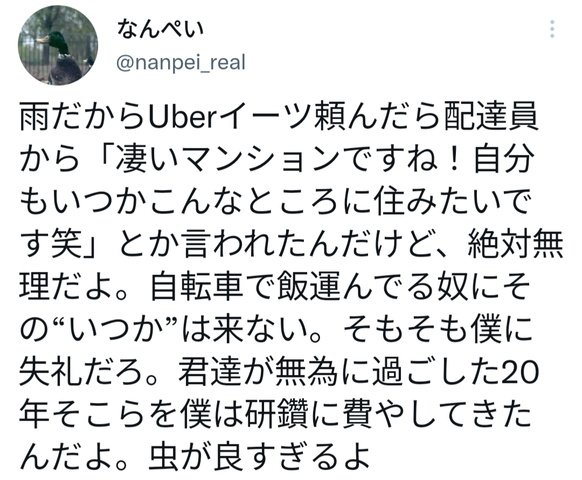 ウーバー配達員「凄いタワマン住んでますね!僕もいつか」住人「そんな仕事してたら無理。僕に失礼」