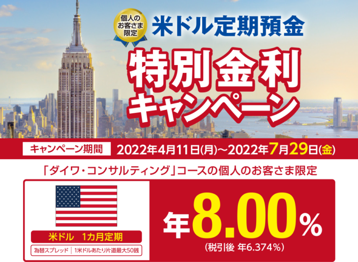 「米ドル定期預金 特別金利キャンペーン 年8.00%(税引後、年6.374%)」
