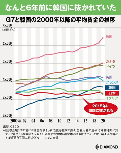下のグラフを目にしたことがある人は多いだろう。これは、世界主要7カ国(G7)と韓国の平均賃金(年収)の過去20年間の推移を表したものだ(出所:OECD〈経済協力開発機構〉、ダイヤモンド・オンライン『日本人は韓国人より給料が38万円も安い!低賃金から抜け出せない残念な理由』より引用)。