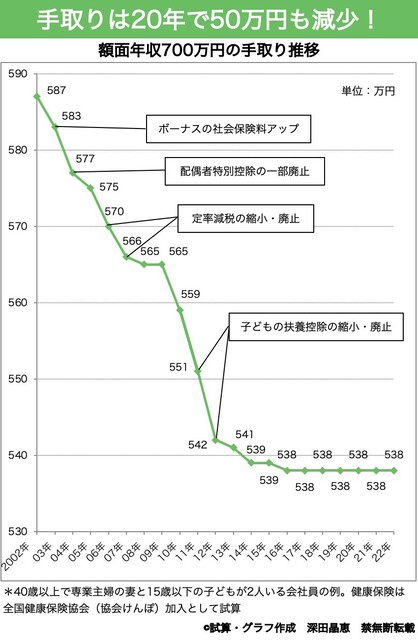 下図は、額面年収700万円の人の02年から22年までの手取り年収推移である。