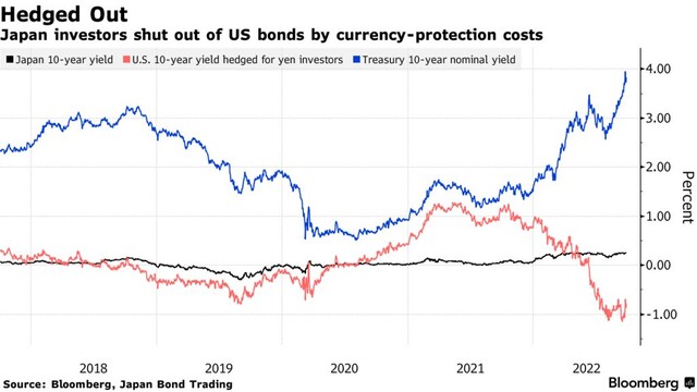 ヘッジコストが急上昇したことで、日本の巨大な年金基金・生命保険会社も米国債市場から実質的に閉め出された。米10年債利回りが4%を上回ったとしても、リターンから為替ヘッジ費用を差し引かなければならない日本の買い手にとって、実質利回りはマイナスとなってしまう。