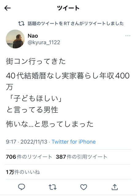 女「街コン行った。40代実家暮らし年収400万円男性が子供希望で恐怖を感じた😨」