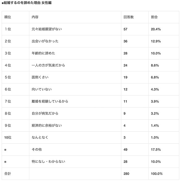 一方、女性の1位は「元々結婚願望がない」(20.4%)、2位は「出会いがなかった」(12.9%)、3位は「年齢的に諦めた」(10%)と続いていた。