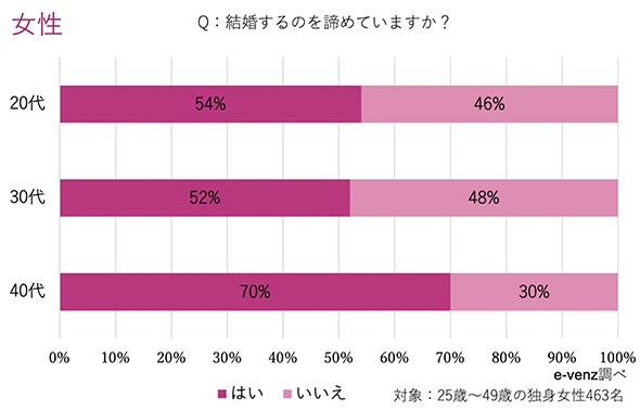 女性からは「結婚するメリットが一つもないから」(28歳)、「親に一度反対されてから、もう面倒くさくなった」(30歳)、「今の世の中結婚が全てではないから」(41歳)、「親と祖母の介護」(35歳)といった声が寄せられた。