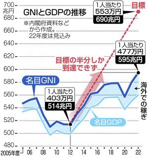 12年末に発足した第2次安倍政権は、再興戦略に民間投資の活性化や成長分野の開拓、海外市場の獲得などの施策を盛り込み、国内総生産(GDP)を10年間の年平均で名目3%、実質2%伸ばすと明記。その上で、GNIは1人当たり150万円増を掲げた。
