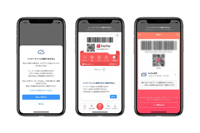 PayPayは、通信障害時やインターネット通信環境が不安定な場合でも、決済を実行できる「オフライン支払いモード」を追加した。これにより、通信障害時や地下や多くの人が集まるイベント会場など、通信が不安定な状況でもPayPayで決済できるようになる。
