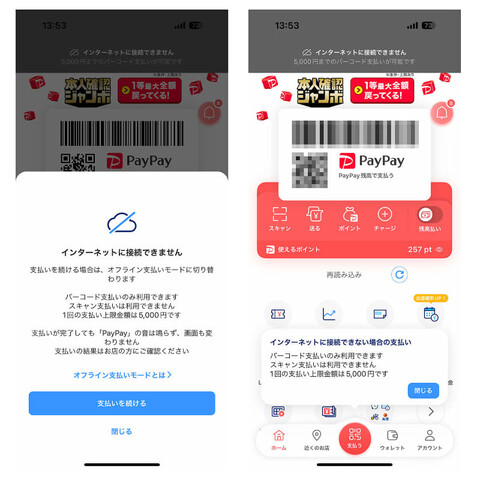 オフライン支払いの場合、ホーム画面上部に[インターネットに接続できません 5,000円までのバーコード決済が可能です]と表示され、支払い後も画面は変わらない。支払い完了し、次に通信に接続した時に決済が完了した旨の通知が行なわれる。