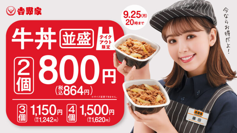 吉野家「牛丼2個で通常880円だが今だけ864円に値下げするCPをはじめるぞ!」