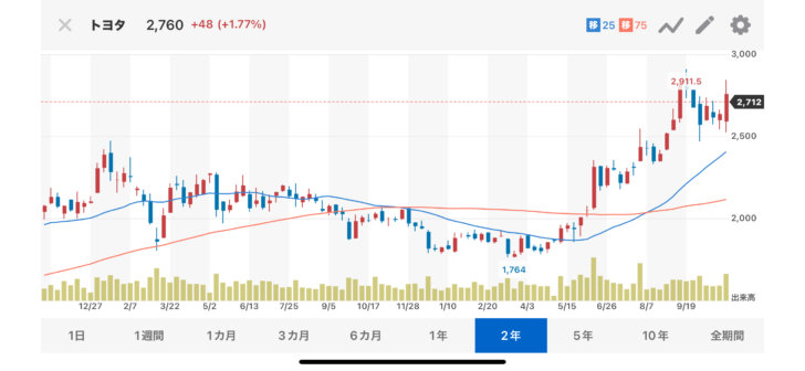 株分割後2500円で買ったら昨年は1800円くらいに下がった時はどうなることかとオモタ🥺