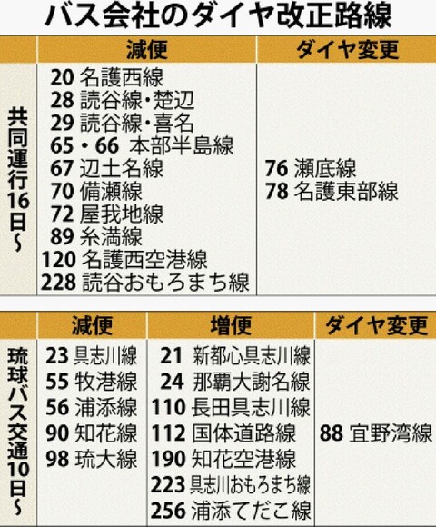【ひと目でわかる】10月から減便した沖縄県内の共同運行バスの路線一覧