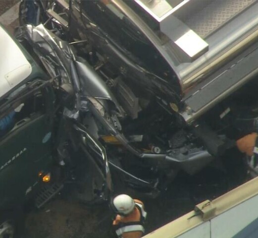 軽自動車、タンクローリーとトラックに挟まれ厚さ30cm程に圧縮されてしまう→