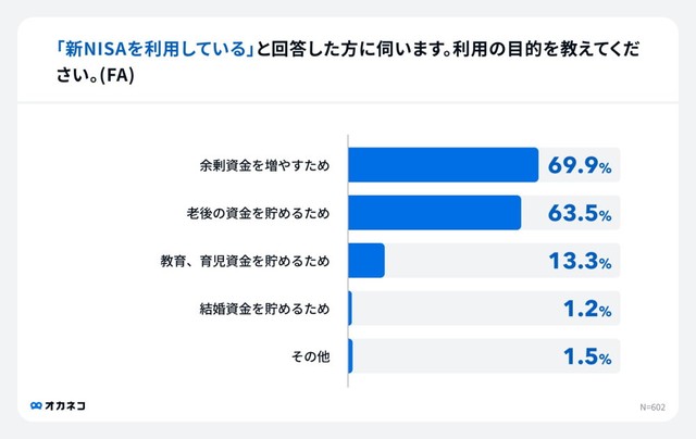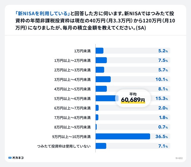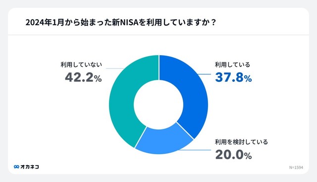 家計診断・相談サービス『オカネコ』を運営する株式会社400F(東京都中央区)が「オカネコ 新NISAの利用意向調査」を実施したところ、「新NISAの利用率」は4割弱であることが分かりました。また、“つみたて投資枠“での毎月の積立平均金額は「6万689円」と高い傾向であることも分かったそうです。