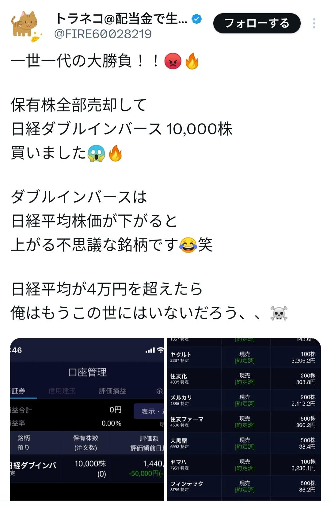 【悲報】配当金で生活する人、保有株を全て売ってダブルインバースに全ツッパする謎行動!