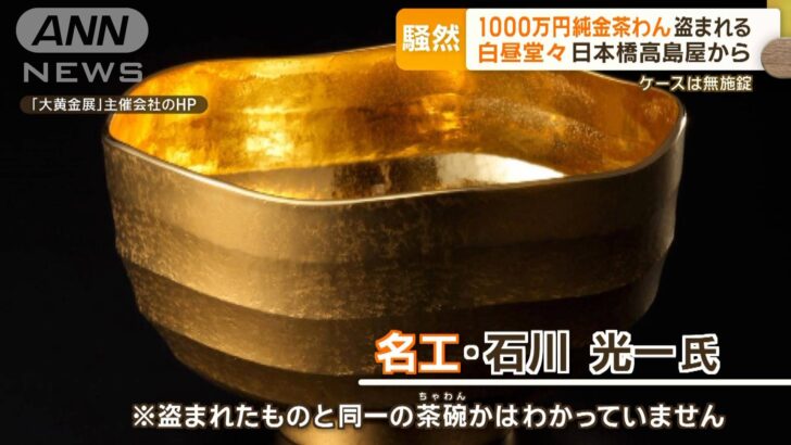 発表によると、男は11日午前11時40分頃、同店本館8階の「大黄金展」会場で、24金製の抹茶茶わん(販売価格約1040万円)を盗んだ疑い。調べに対し、「間違いない。茶わんは売りました」と容疑を認めている。