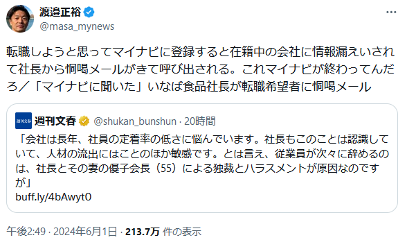 【文春砲】いなば食品社長「お前、転職しようとしてるらしいな。マイナビから聞いてんだぞ」