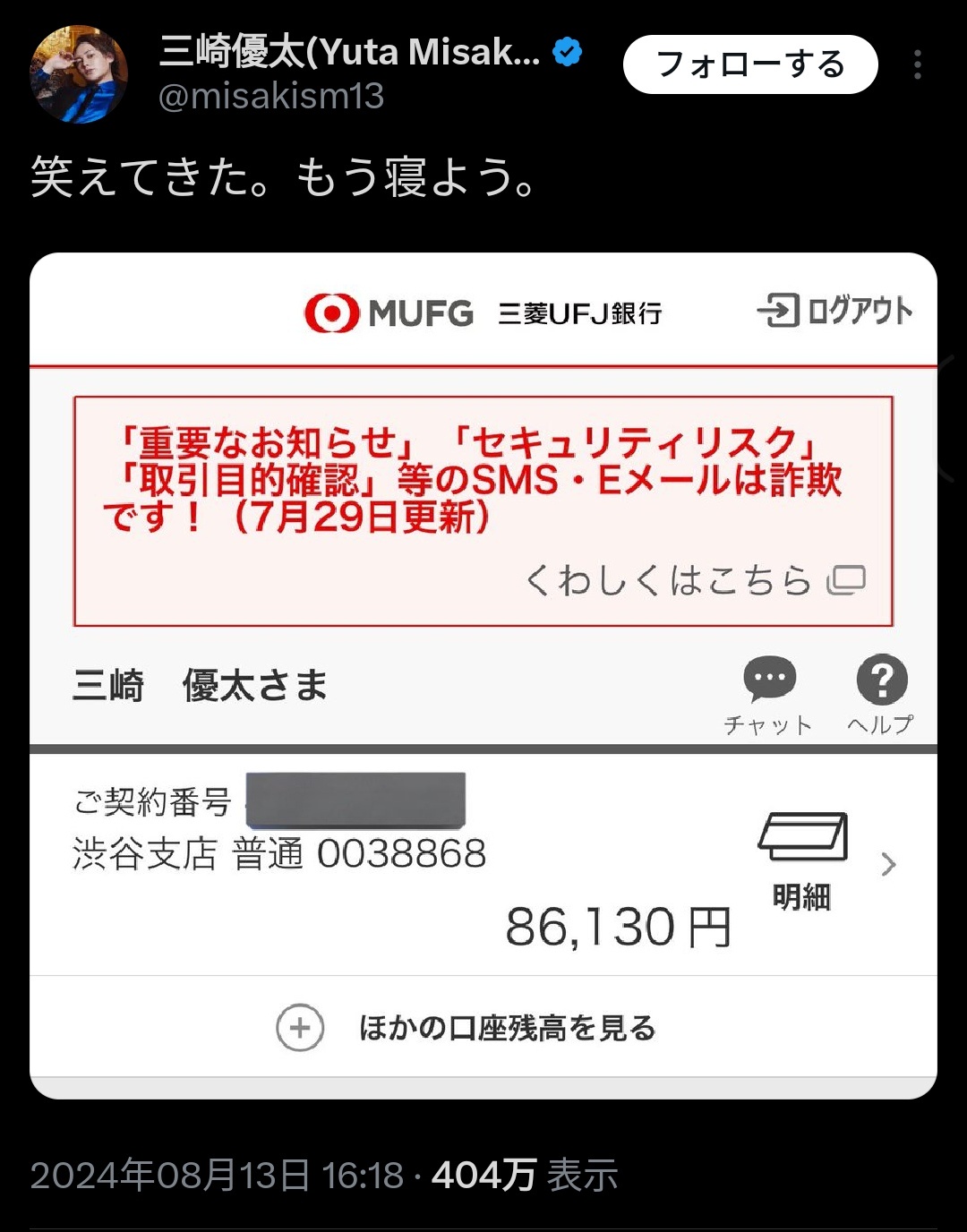 1: 2024/08/13(火) 19:48:59.44 ID:R6wkc9Vd0● BE:323057825-PLT(13000) 実業家の“青汁王子”こと三崎優太氏(35)が13日「X」(旧ツイッター)を更新。金も家 … 続きを読む 実業家系YouTuberさん、全財産を失ったと通帳を公開 →