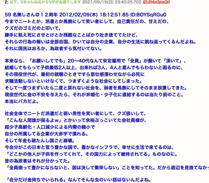 いまの世相をリアルに物語っているような文章だが、しかし私が書いたわけではない。これは匿名掲示板…