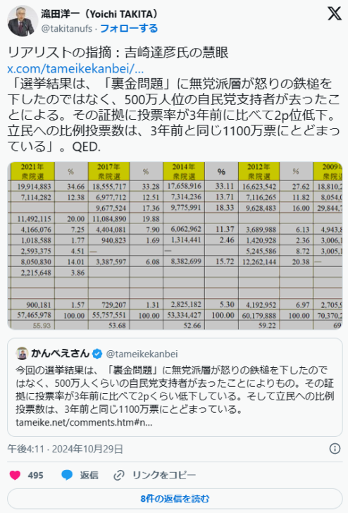 単に生活費の高騰と裏金で500万票減ったの方がよっぽど信憑性あるわ