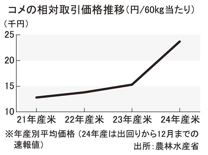 出来秋から同月までの24年産米平均価格は、2万3715円に上り、平成のコメ騒動(1993年)時の2万2296円を抜き、出荷業者と卸売業者間の取引価格として比較可能な1990年以降、過去最高を更新した。