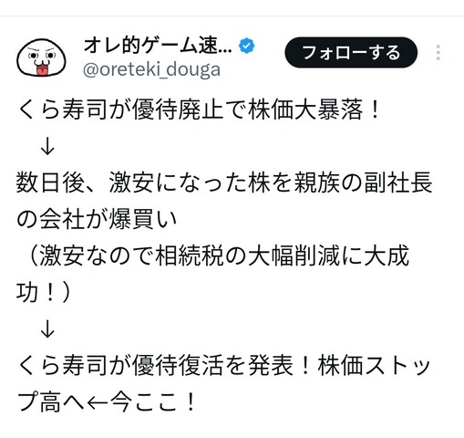 スレ9とかは理解して書き込んでるっぽいけど、24みたいなのは何もわからず雰囲気だけで書き込んでるな。12/17にくら寿司の副社長が資産管理会社に250万株を市場外で売った。資産管理会社の代表取締役はこのくら寿司の副社長。つまり、副社長個人の持ち物だった250万株を資産管理会社の名義に変えただけで株数は増減していない。ただ、名義の移動に伴い含み益が確定益になるから、株価が高いと多額の譲渡益税がかかってしまうので、株価が低い時に行う方が有利。