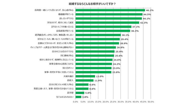 また、第6位の「金銭感覚が似ている」(36.3%)、第7位の「経済観念がしっかりしており、無駄遣いをしない」(30.1%)などからは経済的な「安全性」を、第9位の「安定した収入がある」(28.9%)、第11位の「自分のことは自分でできる」(25.9%)などからは将来にわたる「安定性」を重視していることがうかがえる。