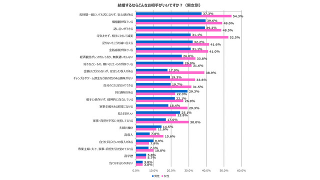 一方、女性は「長時間一緒にいても苦にならず、安心感がある」(54.3%)や「浮気をせず、相手に対して誠実」(52.5%)が半数を超えており、精神的な安定や信頼性を最も重要視していることが判明。