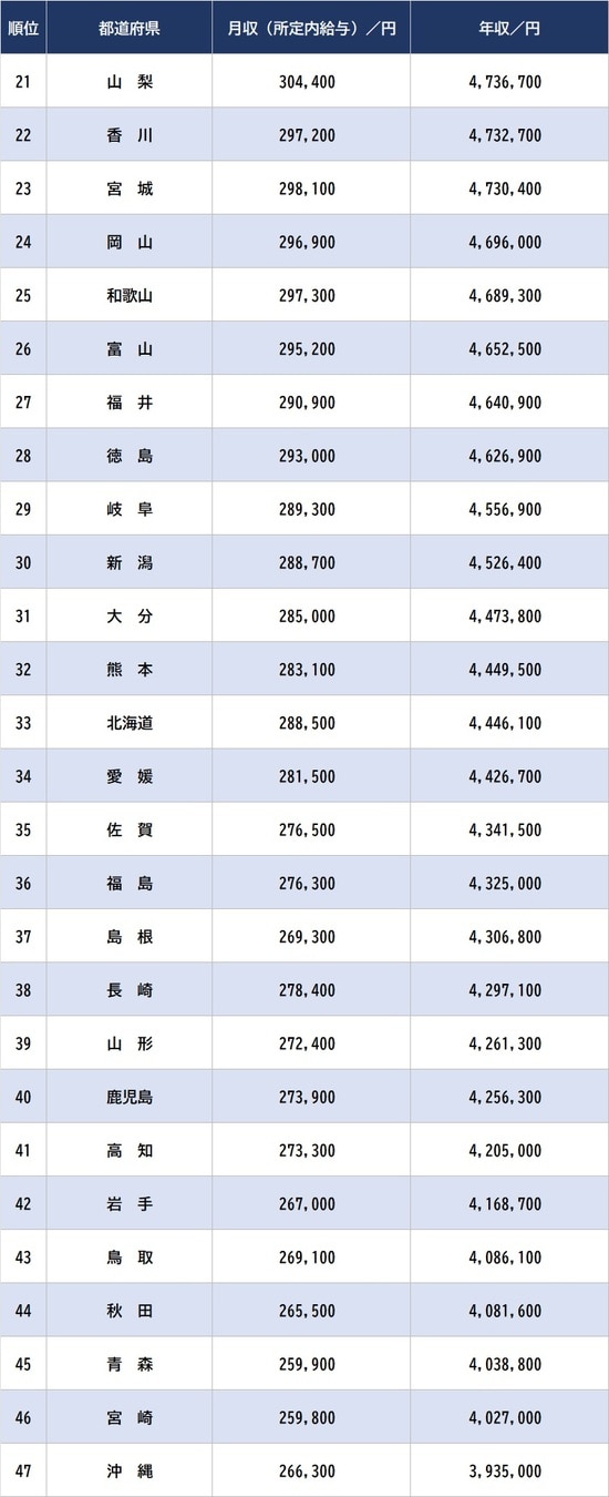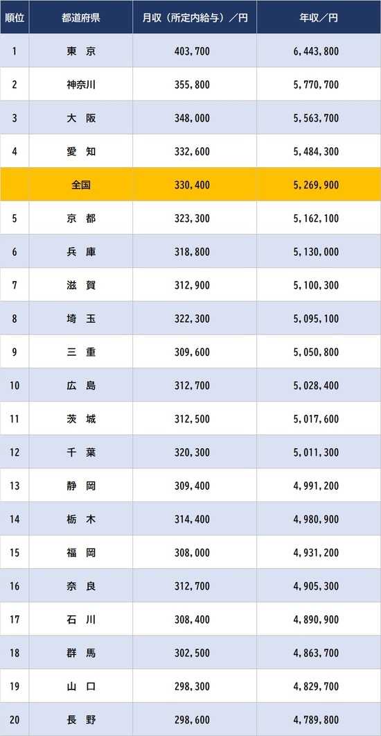 【都道府県「会社員の平均月収」上位5、下位5】※数値左より月収/年収