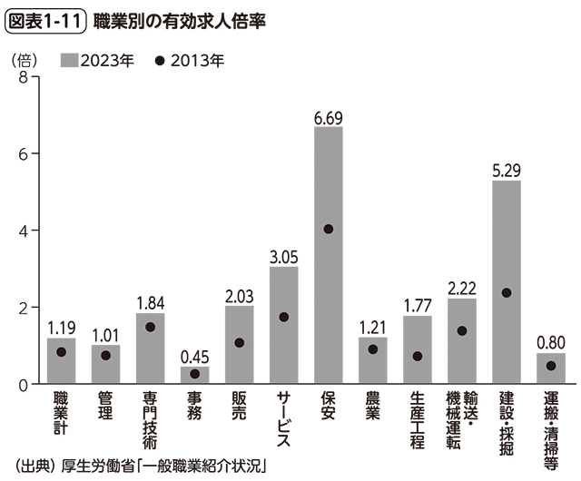 日本全国の企業で人手不足が深刻化しているなか、どのような仕事で特に人が足りていないのだろうか。図表1-11は厚生労働省「職業安定業務統計」から職業別の有効求人倍率を取ったものである。