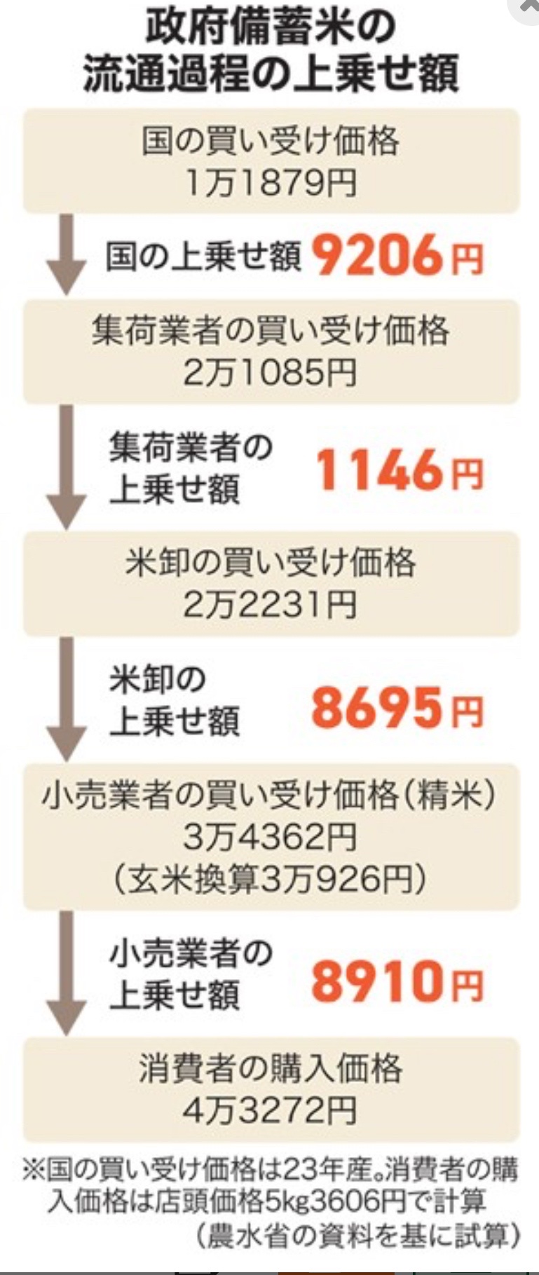 日本農業新聞は、政府備蓄米を扱う国、集荷業者、米卸、小売業者について、備蓄米を販売する際に利益や経費として、いくら上乗せしているか試算した。