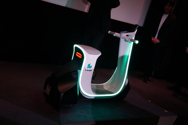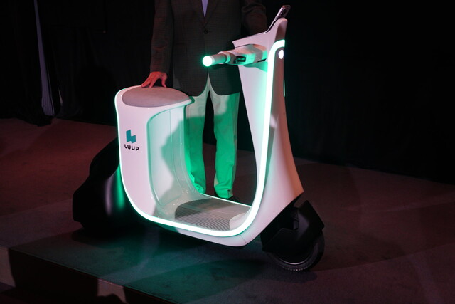 白・黒を基調とした、曲線的なシルエットの車両。車体には1本の長いラインが走り、緑に光る。最高時速は20km(歩道や路側帯用モードでは6km)で、姿勢制御機能として、速度とハンドルの角度に応じて車体の傾きをモーターで自動調整する「リーンアシスト」も備える。大きさは130(幅)×59.5(奥行)×120(高さ)cmで同社の電動キックボードと同程度。Luupの既存ポートに駐車できるという。