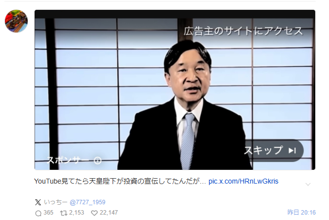 投資のチャンネルよく見るけど陛下の広告は見たことないな。でもこれは間違いなくアウトだろ