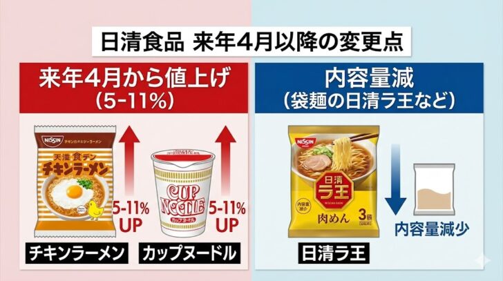1: 2025/12/03(水) 21:18:35.09 ID:QQRx7bKg9日清食品は3日、即席袋麺の「チキンラーメン」や即席カップ麺の「カップヌードル」など主力商品の価格を来年4月の出荷分から値上げすると発表した。メーカー希望小売価格を5-11%上げる。