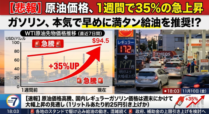 【悲報】原油価格、1週間で35%の上昇。本気でガソリン早めに入れといた方がいいかも!?
