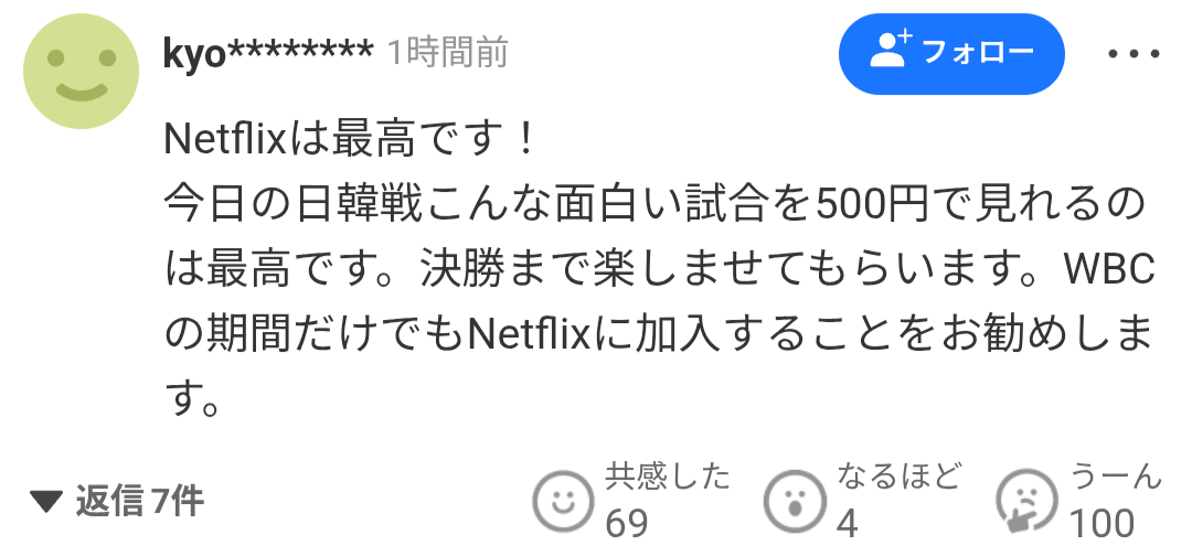今日の日韓戦こんな面白い試合を500円で見れるのは最高です。決勝まで楽しませてもらいます。WBCの期間だけでもNetflixに加入することをお勧めします。
