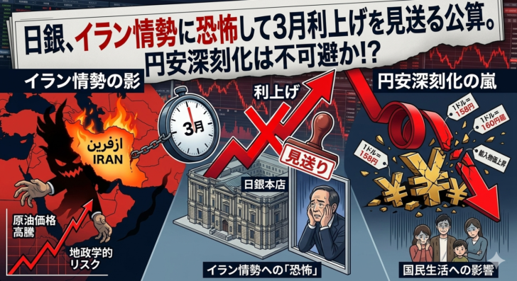 日銀、イラン情勢に恐怖して3月利上げを見送る公算。円安深刻化は不可避か!?