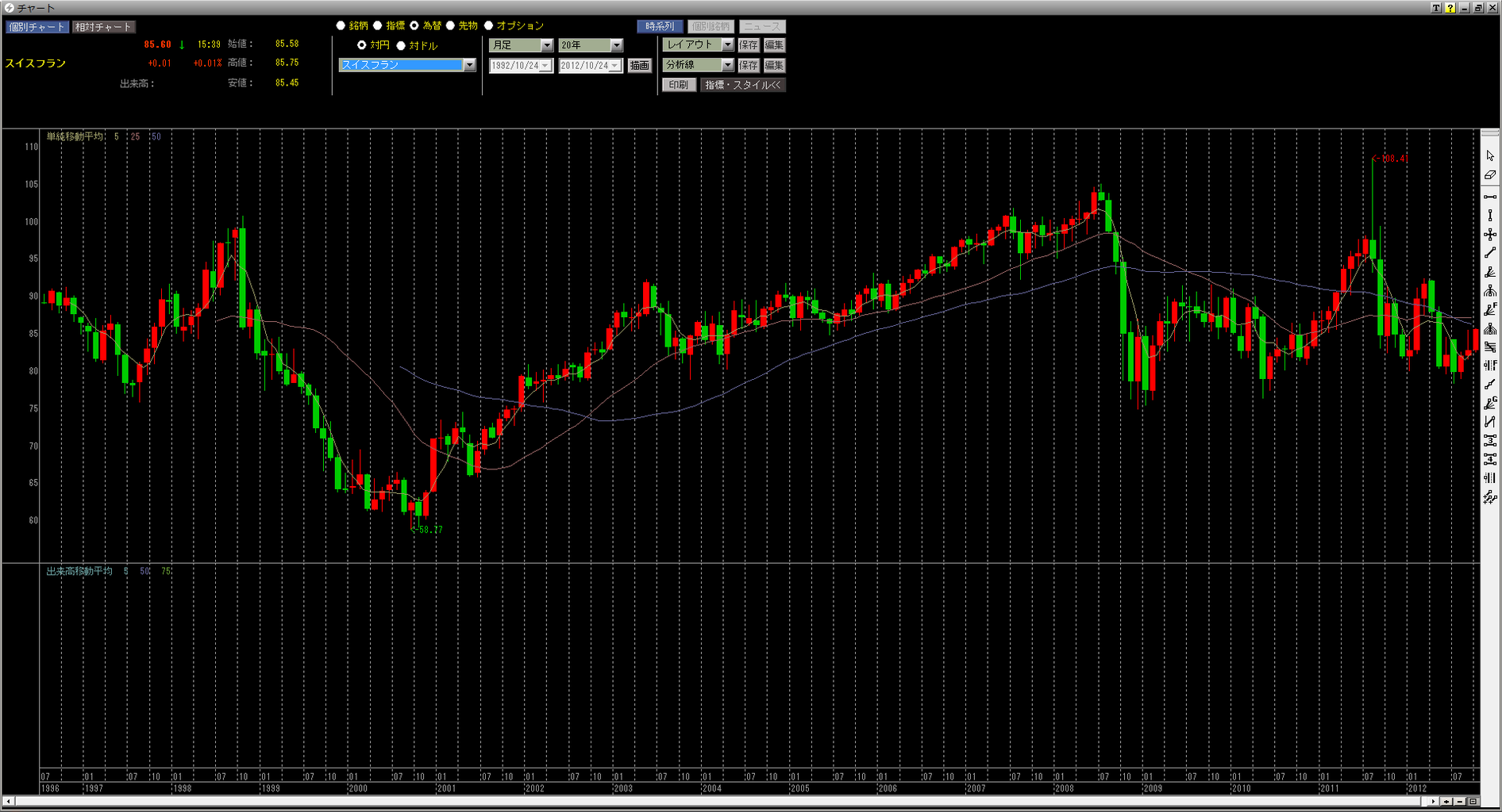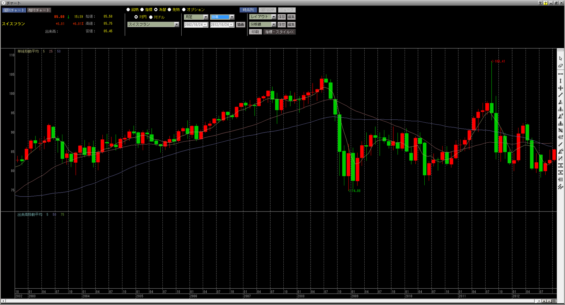 【高解像度FXチャート】過去データ10年・20年スイスフラン・円チャート【CHF/JPY】