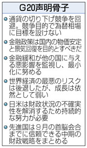 ただ、新興国は先進国の金融緩和に対し「金融市場の混乱を引き起こす」(メキシコのカルステンス中央銀行総裁)との警戒感は根強い。今回の共同声明も、日米欧の金融緩和による投資マネーの流入が、新興国だけでなく、世界経済の不安定化につながる懸念を指摘した。大胆な金融緩和を掲げる安倍政権にとっては経済運営にクギを刺された形で、今後、デフレ脱却と海外批判をにらみながらの難しいかじ取りを迫られる。